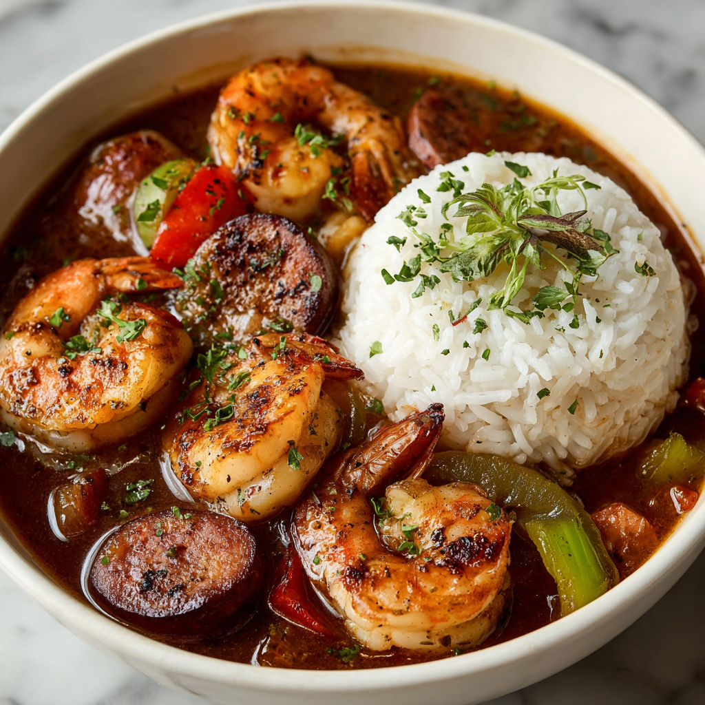 Truffle Spiced Gulf Shrimp and Sausage Gumbo with Garlic Rice